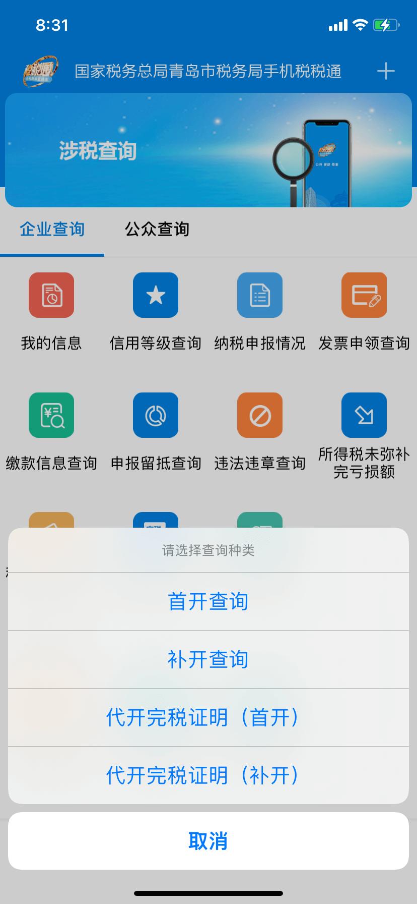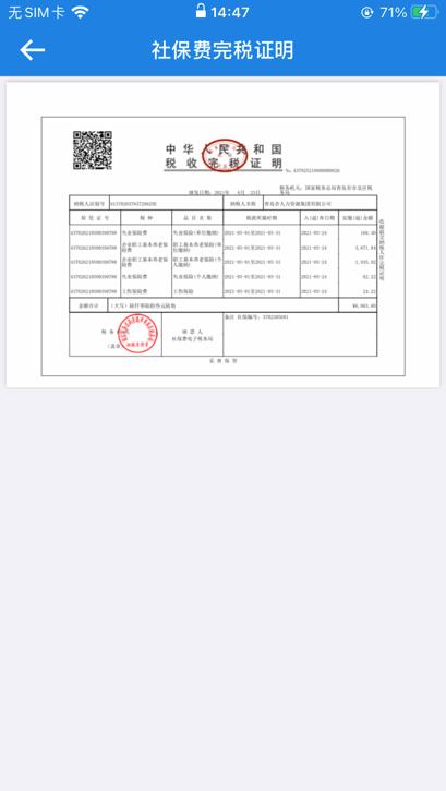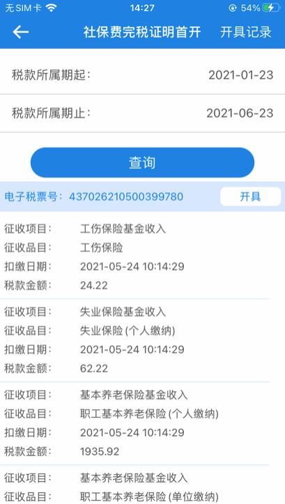 进入查询界面点击企业查询“社保费完税证明”,点击“补开查询”。进入社保费完税证明补开界面,选择开票日期起止时间,点击查询出现列表。点击列表右上角“开具”即可下载并查看该电子税票号具体开具内容。查看开具记录同上。如下图: