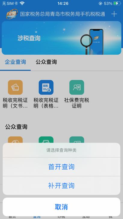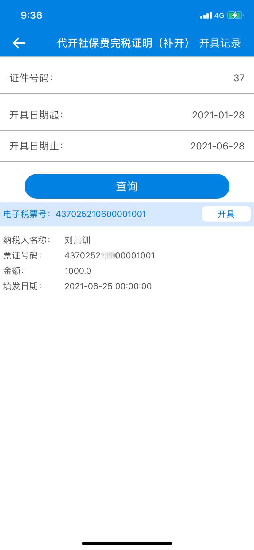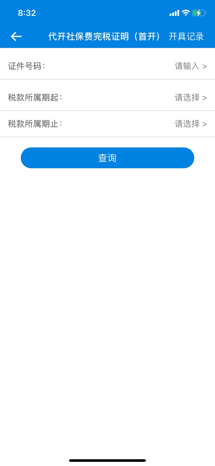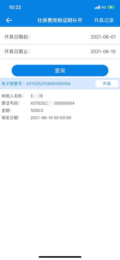 进入查询界面点击公众查询“社保费完税证明”,点击“补开查询”。进入社保费完税证明补开界面,选择开具日期起止时间,点击查询出现列表。点击列表右上角“开具”即可下载并查看该电子税票号具体开具内容。查看开具记录同上。如下图: