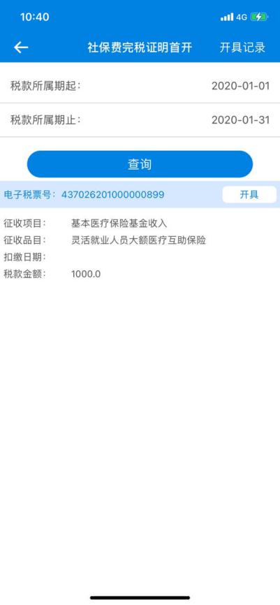 进入查询界面点击公众查询“社保费完税证明”, 点击“首开查询”。进入社保费完税证明首开界面,选择税款所属期起止时间,点击查询出现列表。点击“开具”即可下载并查看该电子税票号具体开具内容。查看开具记录同上。如下图: