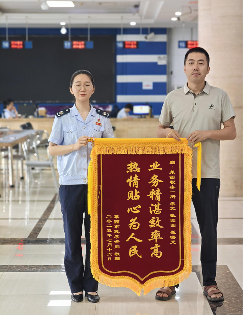 近日,莱西市税务局办税服务厅收到一面绣有“业务精湛效率高,热情贴心为人民”的锦旗,为纳税人李先生对莱西市税务局工作人员提供的专业、高效的服务表示诚挚感谢。