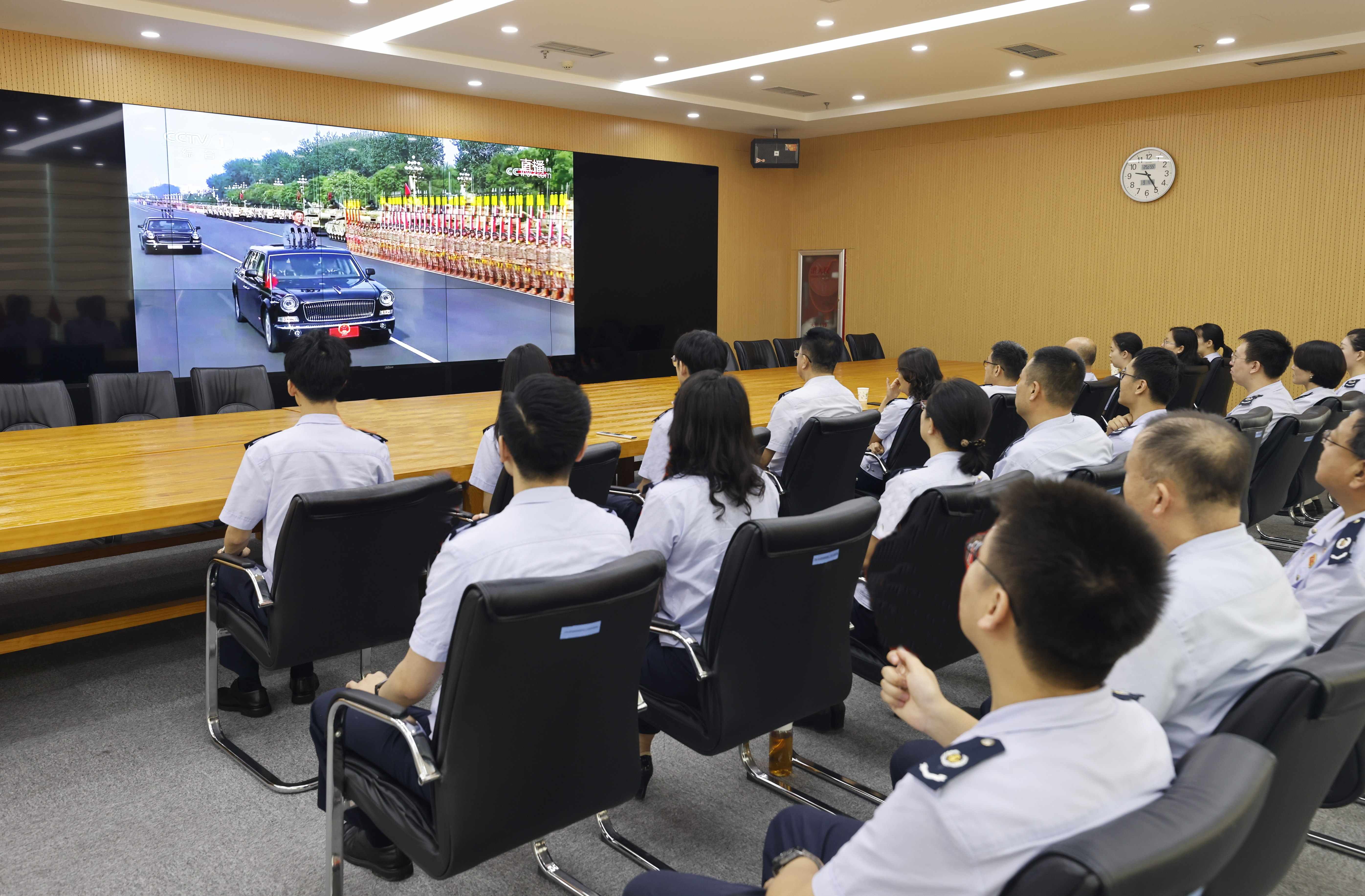 上午9时整,阅兵仪式正式开始。伴随着庄严的国歌声和冉冉升起的五星红旗,会场气氛肃穆而热烈,干部职工们全神贯注,紧盯屏幕,共同见证这一历史性时刻。一队队威武之师迈着整齐的方步越过主席台,全体干部职工被官兵们威武雄壮的气势、昂扬奋进的风貌感染,浓郁的爱国主义气氛充满各个观看会场。